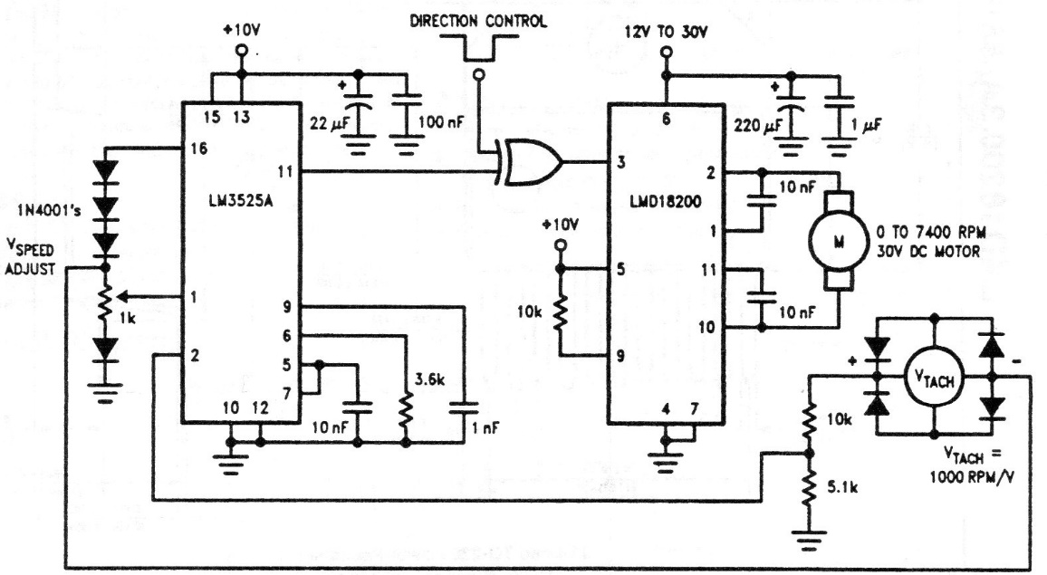 This circuit consists of a speed regulator for direct current motors. The integrated circuit used LMD18200 is not very common today. The circuit is from an application manual from National Semiconductor that today is a company of the Texas Instruments group. The integrated circuit used consists of a 3 A x 55 V H-bridge.