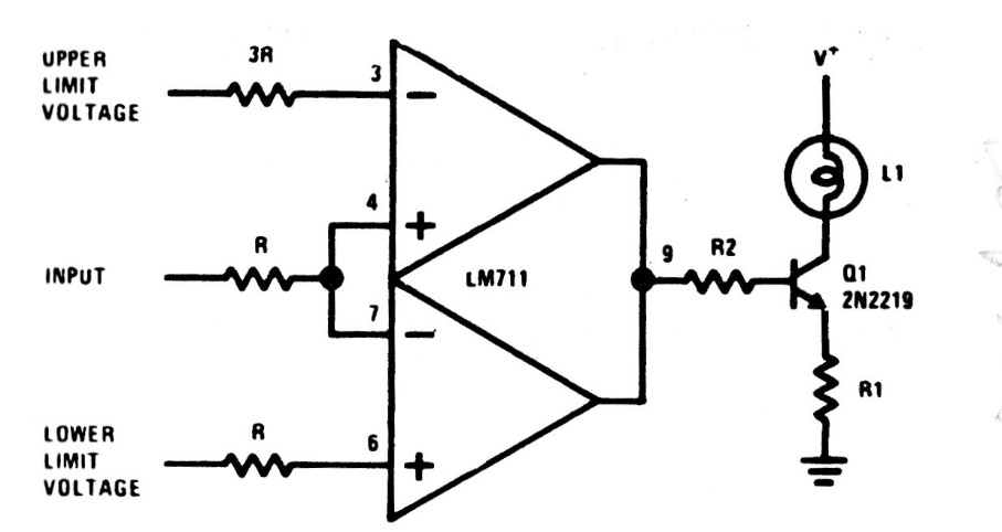 This limit detector or window discriminator uses an old operational amplifier, but it can be implemented with modern comparators or operational ones. The circuit activates a lamp, but another type of charge can be used.