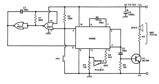 The CMOS 4046 integrated circuit is not very common today, consisting of a very efficient PLL for many low and medium frequency applications. The circuit presented is from documentation translated from the 1960s. The circuit consists of a VCO that is controlled by an oscillator that produces the modulation. The load impedance can be reduced with the use of a power transistor like the BD135.