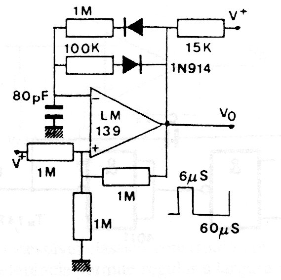 Equivalents of the same series as the LM239 and LM339 can be used in this application. The pulse duration in relation to the frequency can be changed by the 1 M and 100k resistors in the feedback.