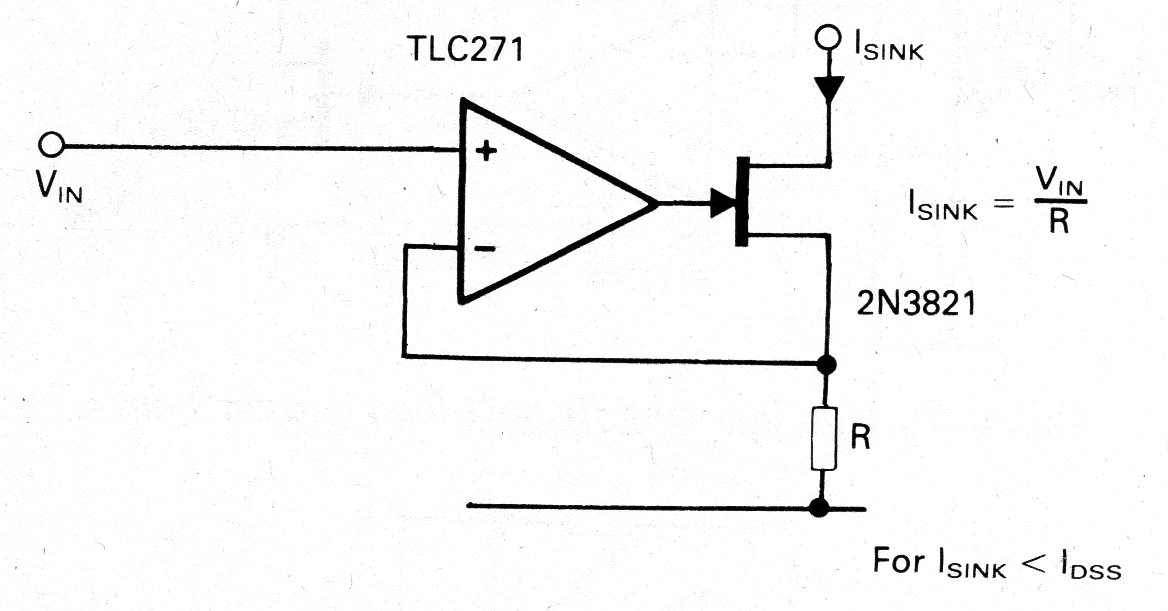 This circuit was found in a Texas Instruments linear application manual. The circuit uses an operational amplifier with JFET and a junction FET. The current is given by the formula at the output.