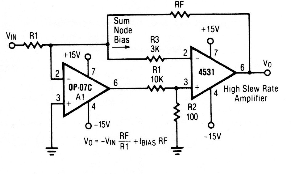 The operational amplifier taken as an example is uncommon today, but the configuration can be made with more modern types. The formula next to the diagram provides the characteristics of the circuit depending on the components.