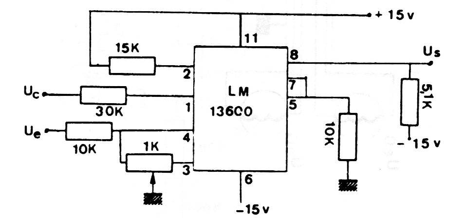 This modulator circuit for low intensity signals is from old documentation. The integrated circuit used is uncommon today. The circuit operates with signals up to 2MHz.