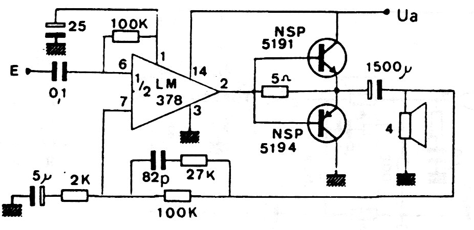 The LM358 integrated circuit used as a driver in this circuit is not very common today. The circuit is from 90s documentation and has a supply voltage of 26dB. Its gain is 79dB and the output transistors can be TIP31 and TIP32. The input resistance is 100 k.