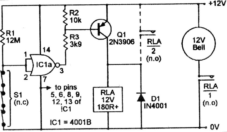 We found this circuit in an American documentation from the 90s. The consumption is only 1 uA in the standby condition. The relays must be of the sensitive type from 6 to 12 V, depending on the supply voltage.