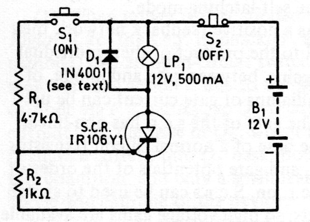 This circuit shows how to trigger and shut down an SCR using common pressure switches. The circuit was found in English documentation from the 1970s, but it is current, as it can be used with most common SCRs, such as those in the TIC series.