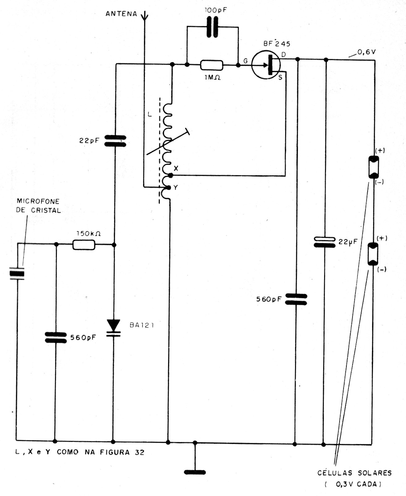 This' 90s circuit emits a signal in the FM band with a few tens of meters in range. The coil is the same as the previous circuit (CB19440E) and the supply can be done with two to four solar cells in series.