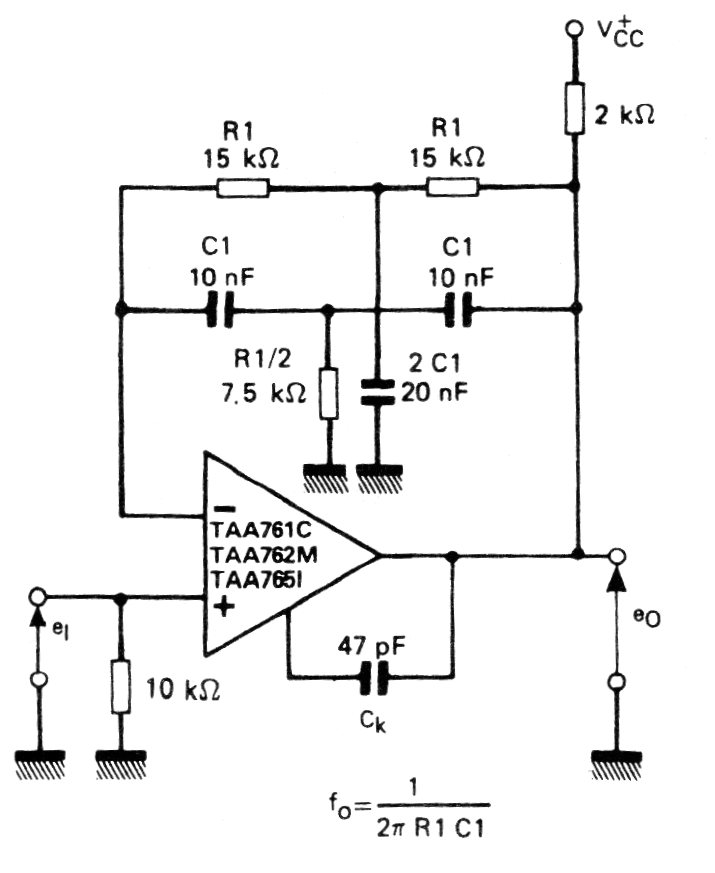 We found this circuit in an old documentation. The operational amplifier used is uncommon today, but the circuit can operate with modern equivalents. The source is symmetrical, and the double T determines the operating frequency range.