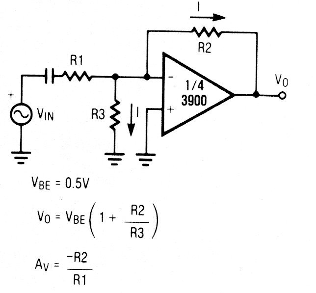 Taking an example of a Raytheon operative as uncommon today, the circuit applies to other operational amplifiers. The formulas are given next to the diagram.