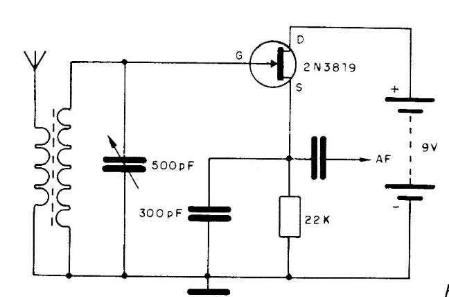 This medium- or short-wave receiver circuit was found in documentation from the 1980s. The circuit uses a detection method created by the Sylvania company of the time. The circuit has its signal applied to an audio amplifier stage. See the previous circuits for information on the coil.