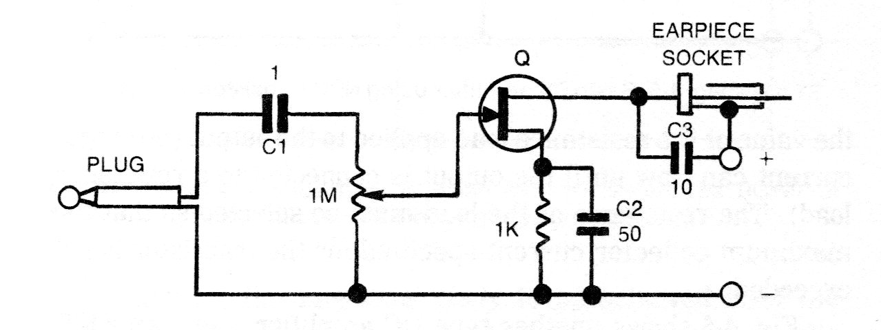 This is a small audio amplifier for headphones for experimental receivers. The transistor can be BF245 or equivalent and the potentiometer adjusts the step gain. The handset must be high impedance magnetic. The supply must be made with voltages from 6 to 12 V.