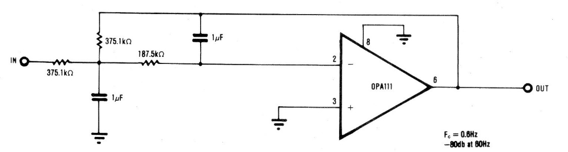 We found this filter in documentation from the 1980s. The operational amplifier used is uncommon today, but the configuration applies to modern equivalents. The power supply must be symmetrical. Calculations for component values can be found in other articles on the website.