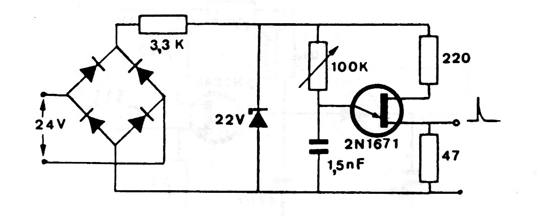 We found this circuit in a 90's European schematic. The circuit can be implemented with almost any unijunction and the bridge diodes are for general use. Synchronization is provided by the capacitor and the potentiometer setting. For the values of the given components the circuit synchronizes at 100 Hz.