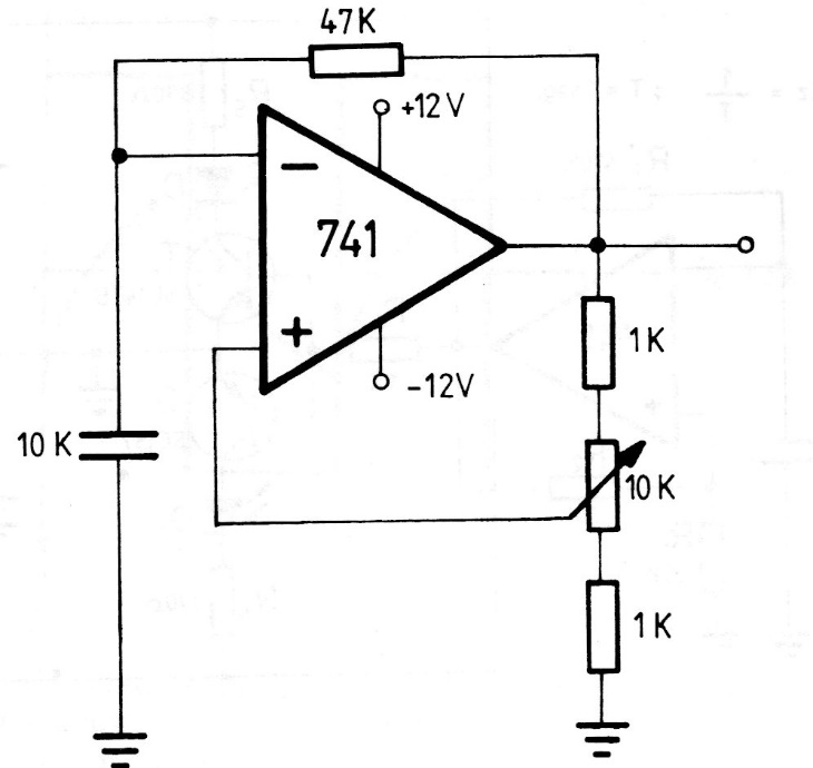 This circuit was found in documentation from the 90s in Europe. The circuit shows how to vary the frequency of an oscillator with the operational 741, in this case between 180 Hz and 4,500 Hz. The output signal is rectangular, and the power supply must be symmetrical. Obs. 10k is 10 nF for the capacitor.