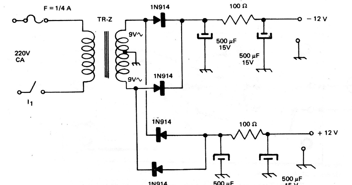 This symmetrical power supply with a current of the order of 100 mA was found in an old documentation. The transformer is 9 V, and the power supply has no regulation. Zeners can be added in parallel with the output, according to the desired voltage.