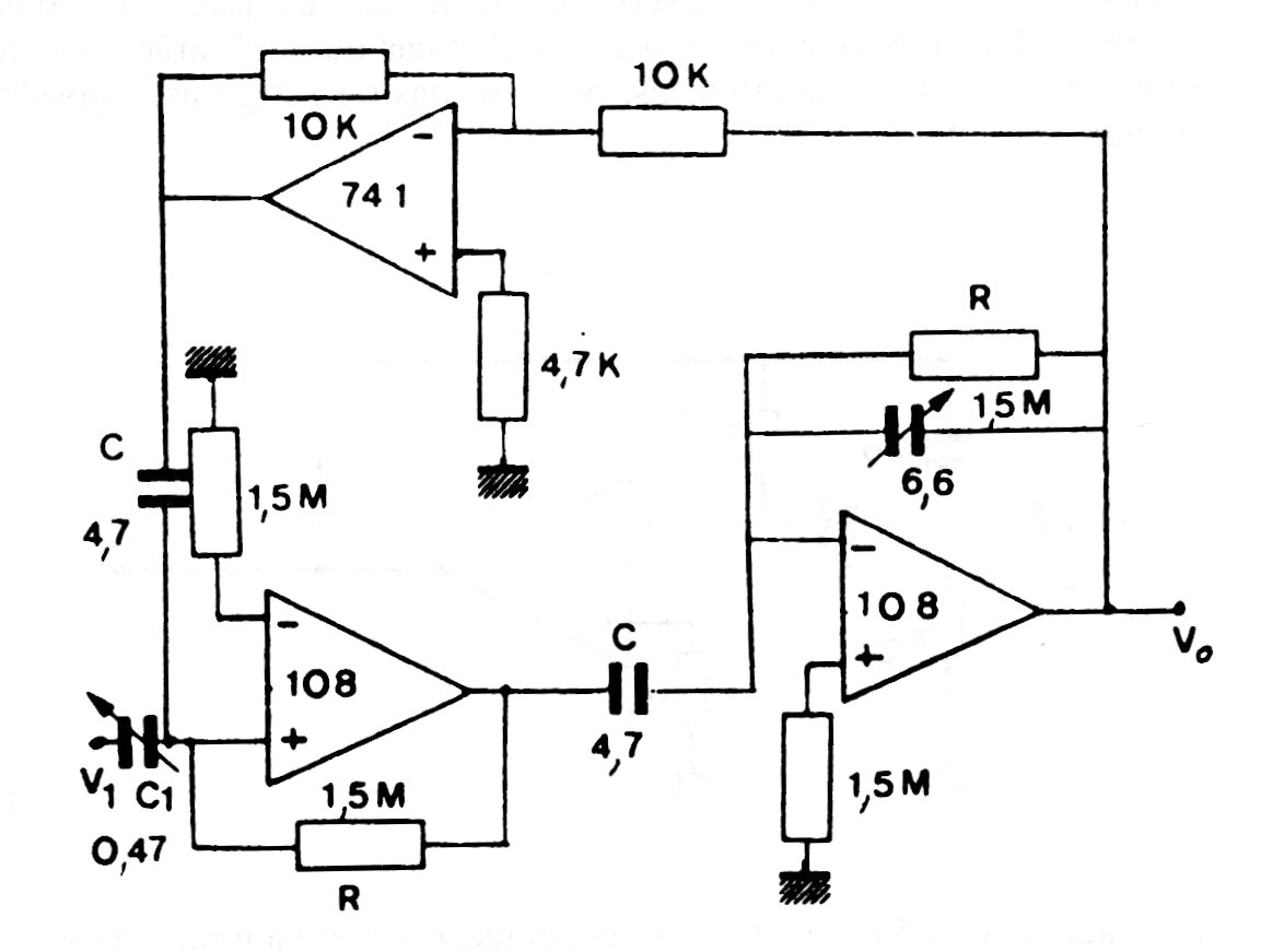 This filter has a cutoff frequency of 0.026 Hz given by R and C. These components can be calculated for other frequencies using the formula w = 1 / RC. Equivalent operational amplifiers can be used, and the power source must be symmetrical.