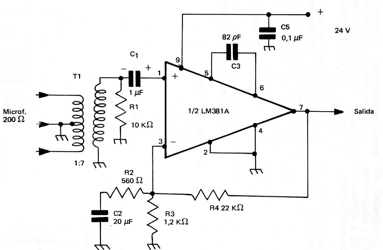 The integrated circuit used in this configuration found in documentation from the 1980s is not common today. The supply is made with a relatively high voltage and the circuit is intended for balanced low impedance microphones.
