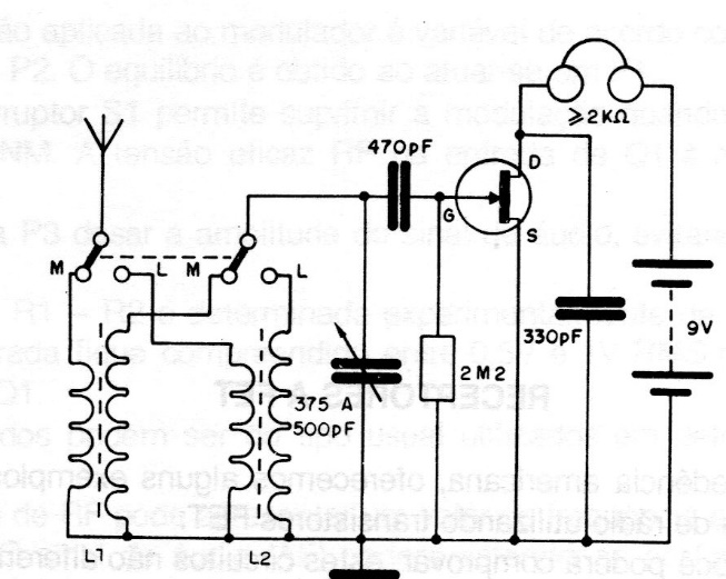 The signal detection in this two-band receiver is made by the gate or gate of the field effect transistor. See the previous circuit for more details (CB19262E). The power can be powered by batteries or source and the handset must be of high impedance. The antenna must be long in the case of weak stations.