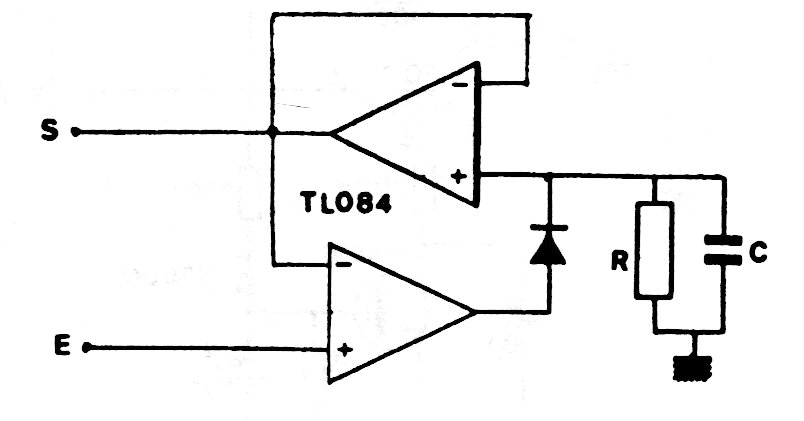 This circuit detects when a signal reaches its peak value. The source must be symmetrical and equivalent operational amplifiers can be used. This circuit was found in an old European publication.