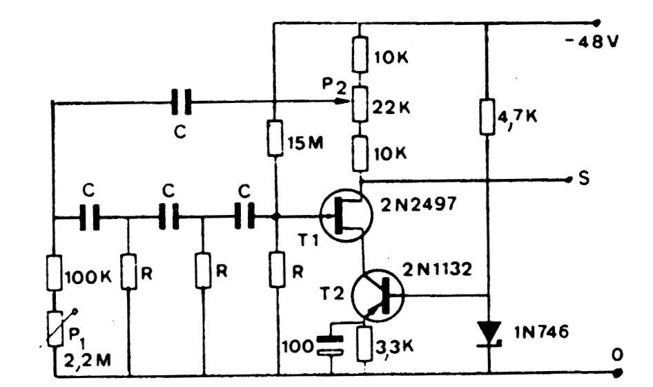 This circuit is from a manual of JFETs and can be implemented with the BF245 and for the bipolar equivalent like the BC548. The frequency is given by the RC network and the output signal is sinusoidal.