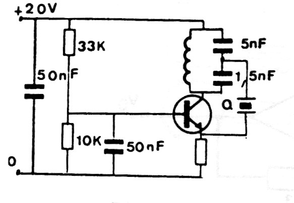 The crystal used in this oscillator can have frequencies up to 30 MHz or more, depending on the transistor. The transistor can be 2N2222 and the capacitors must be ceramic. The coil must be chosen according to the frequency of the crystal so that it resonates with the indicated capacitors.