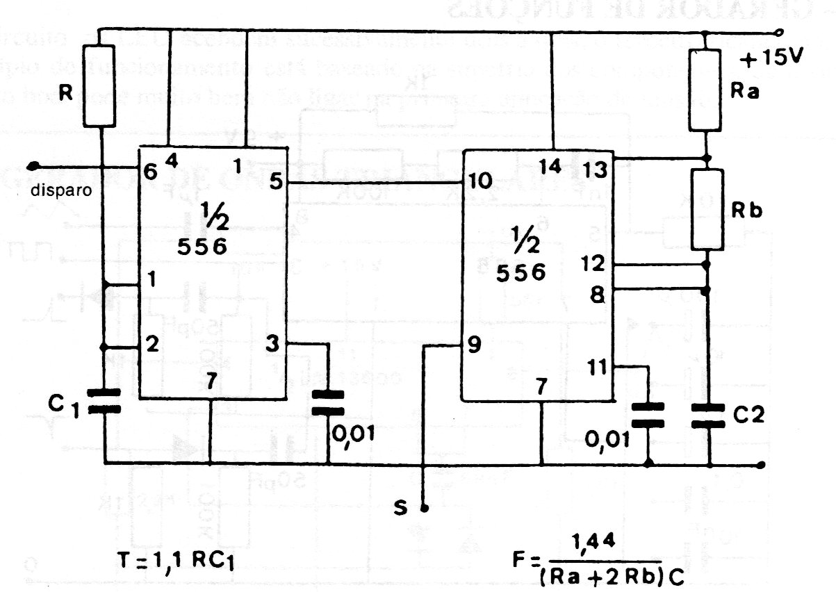 The frequencies and intervals of the signals generated by this circuit are determined by the formulas next to the diagram. The circuit is from an old manual of linear integrated circuits and makes use of PLL integrated well known at the time.