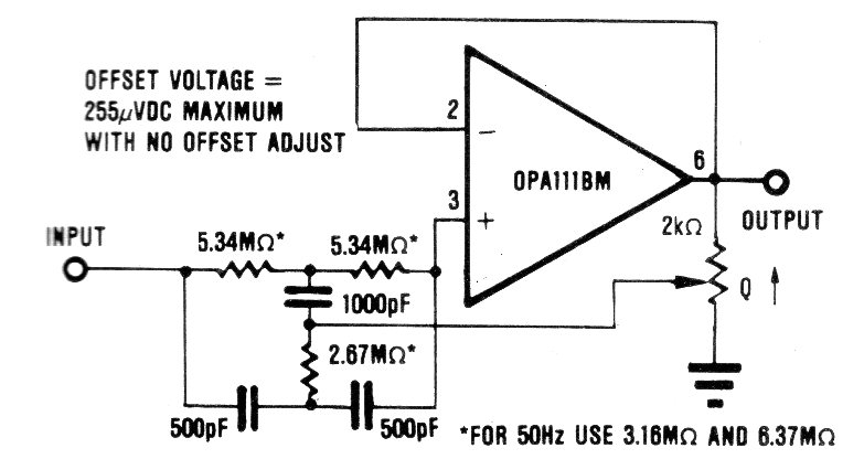 This circuit blocks 60 Hz signals and can be used in filters for audio equipment. The operational amplifier is uncommon today, but equivalents can be used. The circuit is from an old documentation from the 80's and requires a symmetrical power supply.