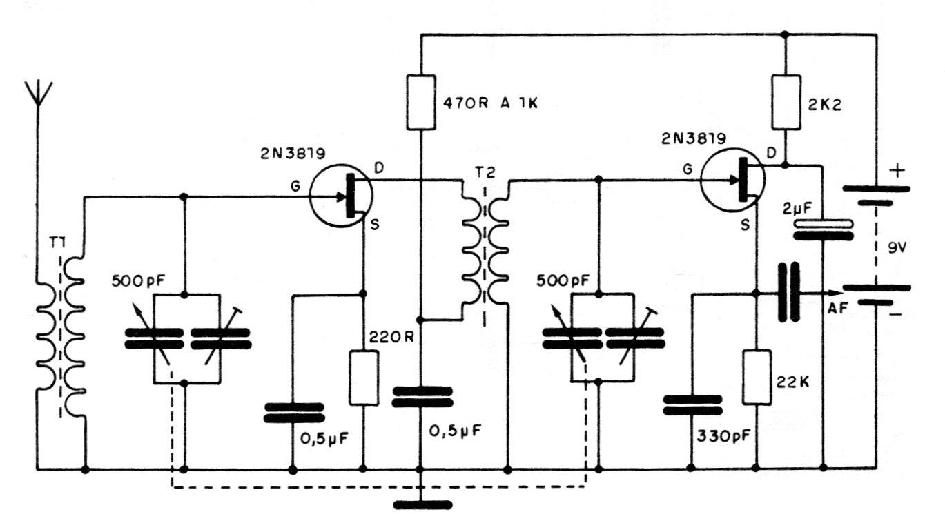 This circuit connected to the input of a good amplifier, with suitable coils can tune stations of medium and short-waves with excellent performance. Details of the coils are given in the previous circuits, but the reader can experiment to obtain the highest performance.