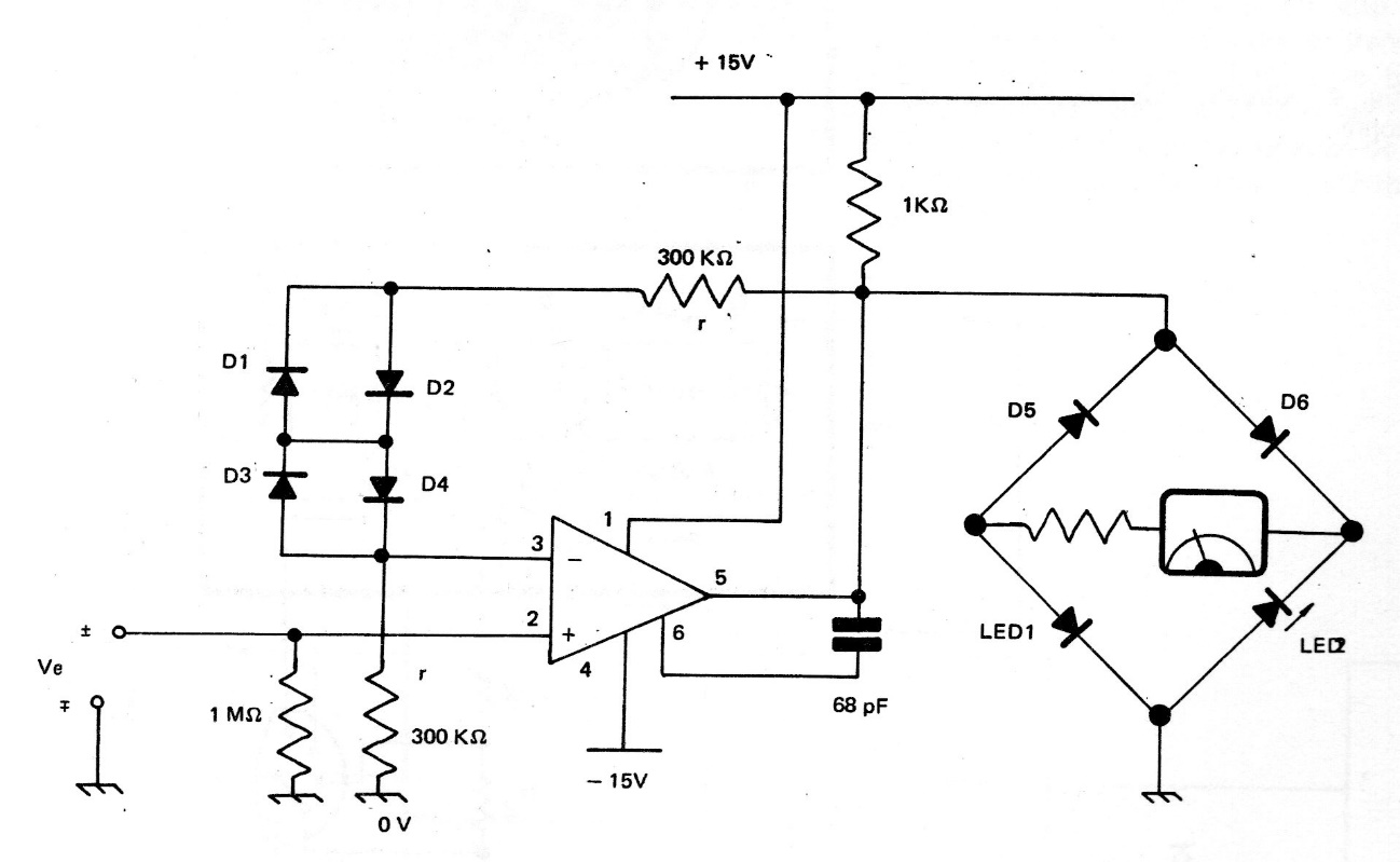 Common operational amplifiers can be used on this circuit. The resistor with no value in series with the instrument has values between 100 ohms and 1 k depending on the resistance of the instrument and its full scale. The circuit requires a symmetrical power supply and has 1 M ohms of input resistance.