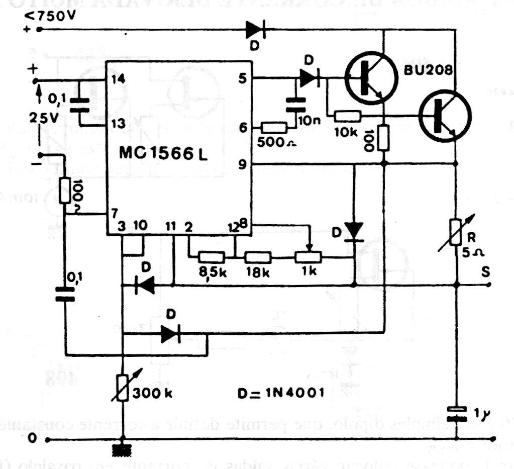 This circuit can be used with input voltages up to 750 V, regulating the current between 200 uA and 100 mA from a 0 to 2.5 V signal. The circuit can be used as a high voltage control shield and must be insulation problems are foreseen. The MC1566L integrated circuit is uncommon today.