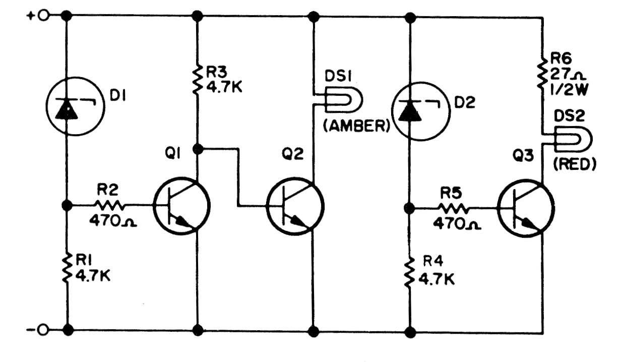 We found this circuit in a 1975 documentation. It monitors the voltage of an automotive system, indicating when it leaves the ranges determined by the zener diodes. LEDs with series resistors can be used instead of indicator lamps.