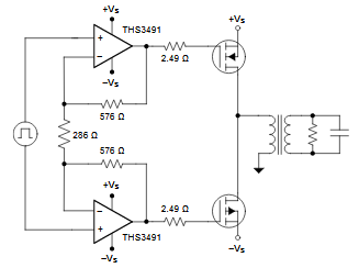 This high-power drive circuit for MOSFET excitation was obtained from the Texas Instruments component datasheet. The supply can be made with voltages from 14 to 32 V and the high current operating has a gain of 5 V / V up to 900 MHz.