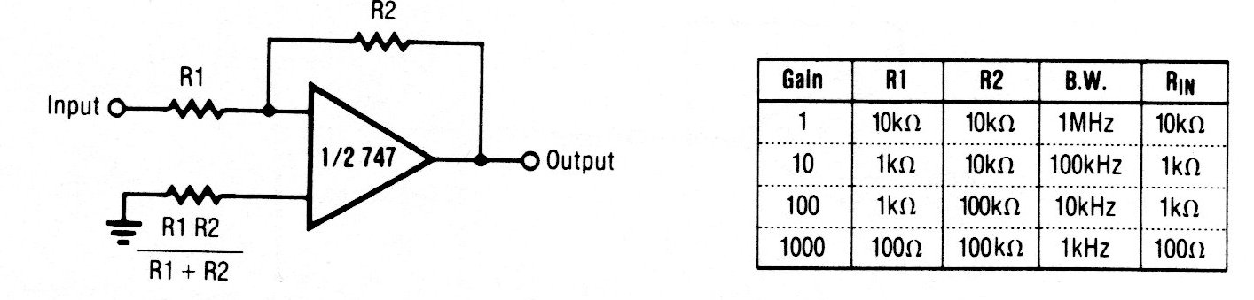 This is the traditional configuration of an inverter amplifier with operational. The operational amplifier taken as an example is rare today, but the circuit is valid for others and on the side, we have a table with the components for various gains and frequency ranges.