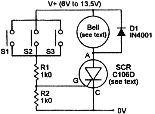 We found this circuit in an American publication from the 90s. The power must be 2 V more than the relay to compensate for the voltage drop in the triggered SCR. The sensors used are of the NO type. To reset the circuit, switch off the power for a moment.