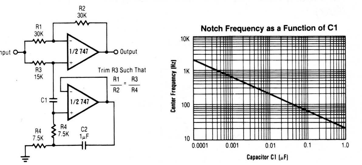 The 747 is an old operational amplifier, but the configuration applies to modern operatives. In this circuit the 747 works like a spinner and in the graph next to the diagram we have the characteristics of the circuit depending on the capacitor.