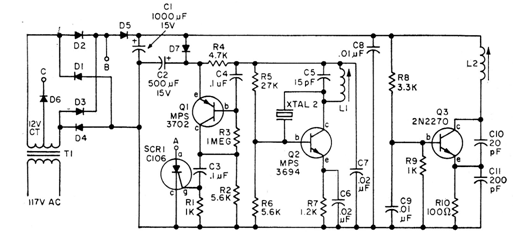 This circuit receives the signals from the previous circuit (CB19055E) by activating an electric lock through the SCR. The L1 coil is the same as that of the transmitter as well as the crystal. The power source diodes are 1N4002 and the transistors support modern BC series equivalents.
