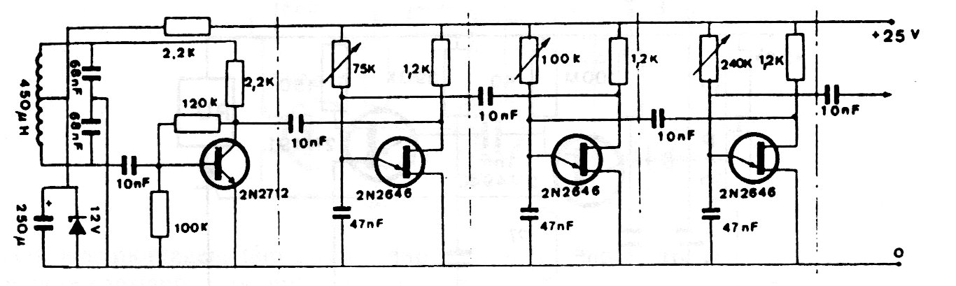 We found this divider in a circuit manual from the 90s. The circuit is intended for operation with low frequency signals. Each stage divides the frequency by 2 in this application. The first stage is an oscillator with a bipolar transistor.