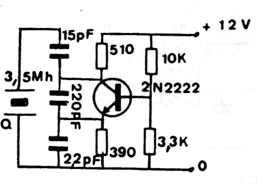 This is a typical quartz crystal oscillator for the 3.5 MHz frequency (80-meter range) used in radio transmitters. The circuit is from an old publication and the capacitors used must be ceramic.