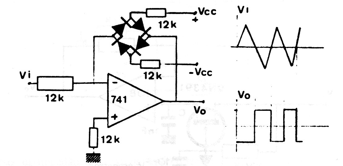 This “zero crossing detector” was found in a manual of operational amplifiers from the 1980s. Diodes are for general use and other operational ones can be used. The power supply must be symmetrical with voltage according to the operation and the application.
