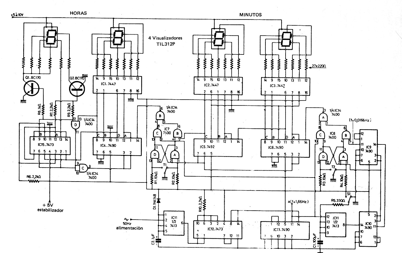 This basic TTL watch and minute clock circuit was found in European documentation from the 1970s. The power supply is not included and is given in CB19635E. The circuit uses common anode displays.
