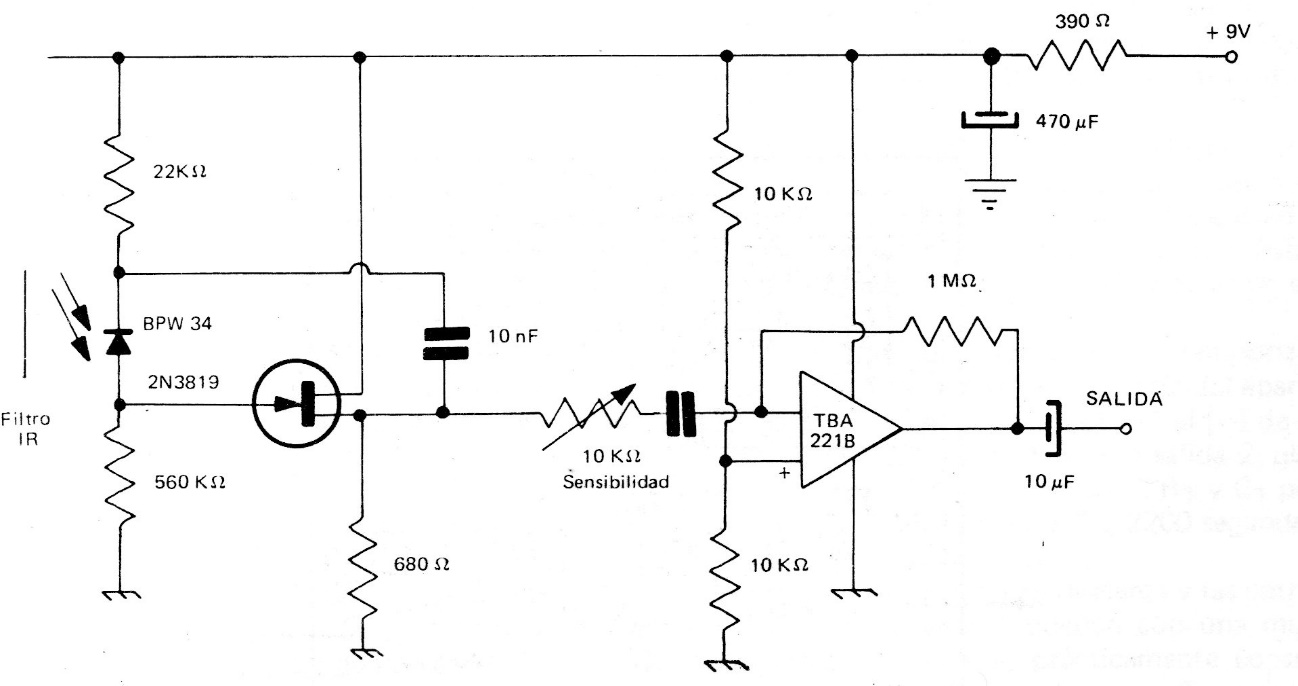This is the receiver circuit for the previous transmitter (CB19628E). The receiver is an infrared photodiode which, for greater range, must use optical resources or even a filter. The signal is an audio tone. The operational amplifier is not very common nowadays, and more modern equivalents can be tried.