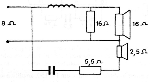 This separator filter is from an old publication. The capacitor can have 10 to 47 uF of the depolarized type and the inductor is 100 mH. The inductor wire must match the power of the system and the resistors are 5W or more.