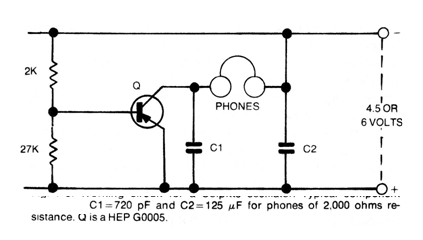 In this circuit of an American publication from the 1980s, the frequency of oscillations is determined by the capacitors and the inductance of the high impedance magnetic phone. Any general purpose PNP transistor can be used and depending on the transistor the supply voltage can range from 3 to 12 V.