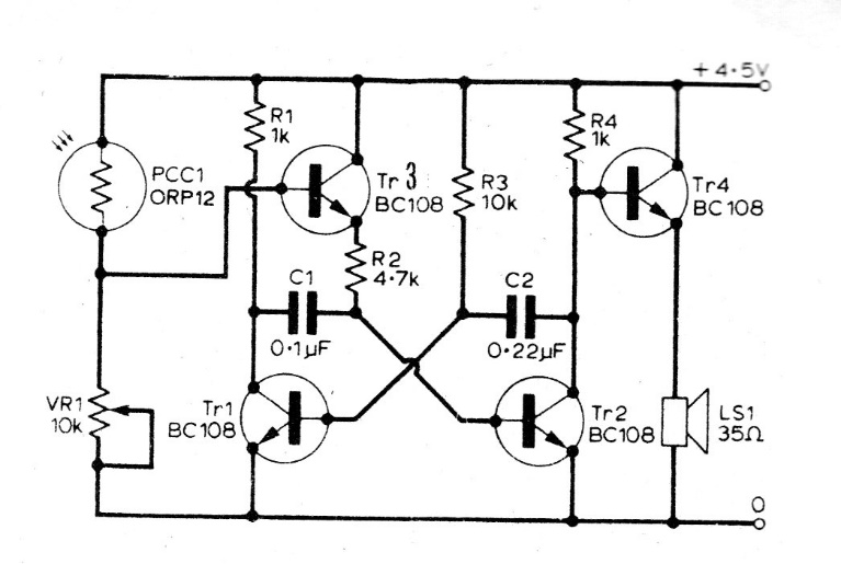 The frequency of this astable multivibrator depends not only on the capacitors, but also on the light that strikes a sensor. The sensor is a common LDR and the transistors can be the BC548. The circuit can function as a sound shield if the LDR forms an optical coupler with an LED controlled by a microcontroller.