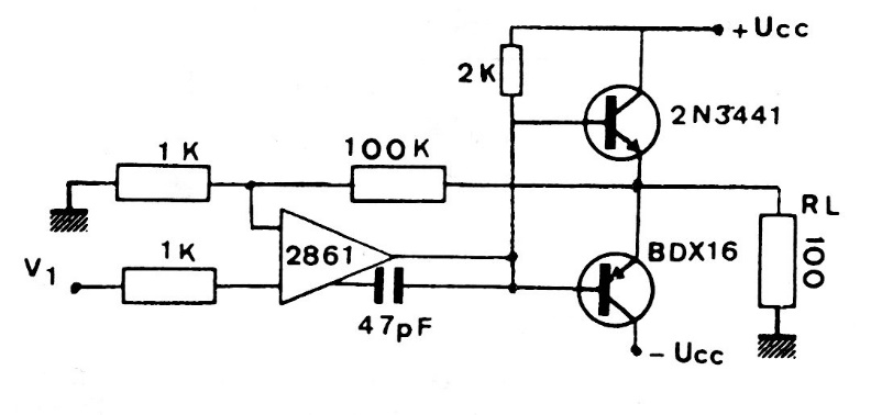 This operational amplifier circuit with power output using complementary transistors was found in a European publication from the 1980s. Transistors can be modern equivalents such as BD135 and BD136 and the operational also admits equivalents. The font must be symmetrical and depends on the operational and the application.