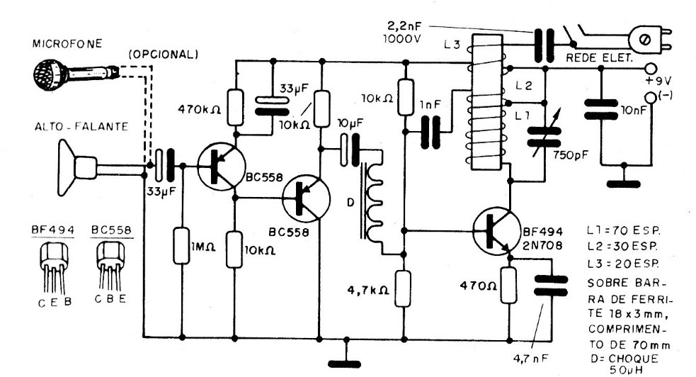 This transmitter was found in an old publication on espionage. It applies a signal of a few hundred kilohertz directly to the power grid. The microphone can be a speaker or a common type. The power can be done with ordinary batteries or power source.