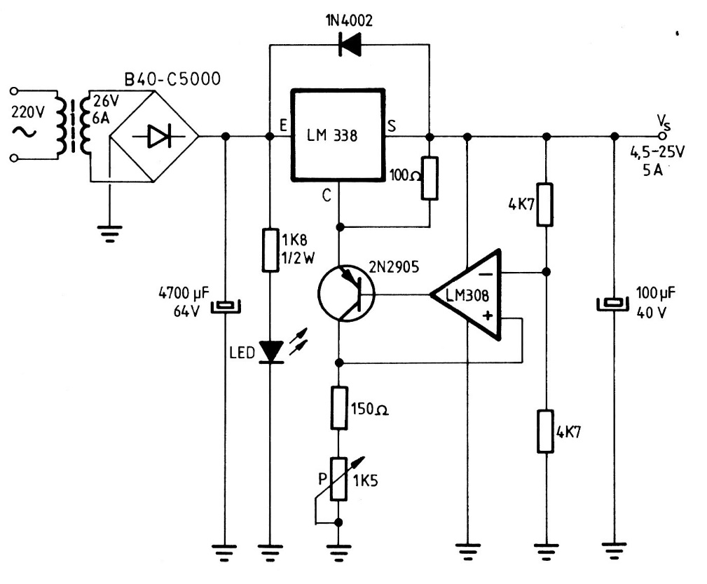 This excellent bench source is based on the LM338 integrated circuit, which must be mounted on a good heat radiator. We found this circuit in an 80's documentation. The operational amplifier can be replaced by an equivalent and the bridge diodes are for 5 A.