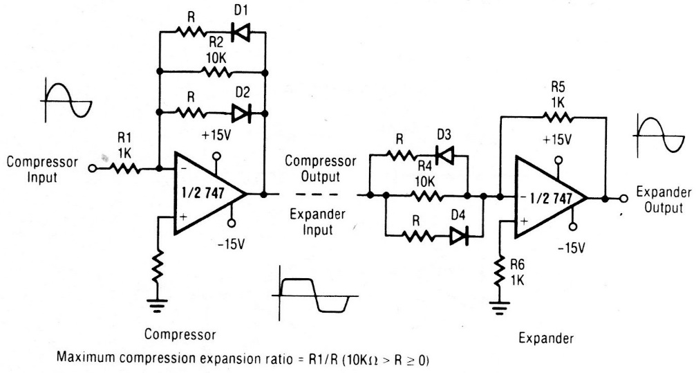 This circuit compresses signals and then expands them to facilitate the transmitter. The operational ones used are not common today, but the circuit can be adapted to use more modern types. The power source is symmetrical.