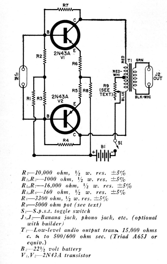 This amplifier for audio transmission lines was found in a 1961 American publication. The critical components are transistors and transformers. For transistors, equivalents can be used. Observe the high voltage of the power supply used with the transistors of the time.