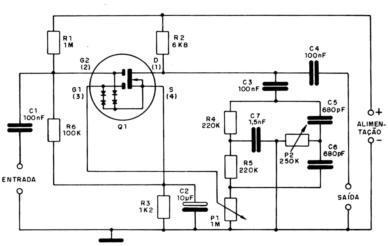 This interesting circuit lets frequencies centralized in a value given by the components pass, as shown in the table next to the diagram. The MOSFET used is of the common type, and practically any similar one with gate protection and double gate can be used.